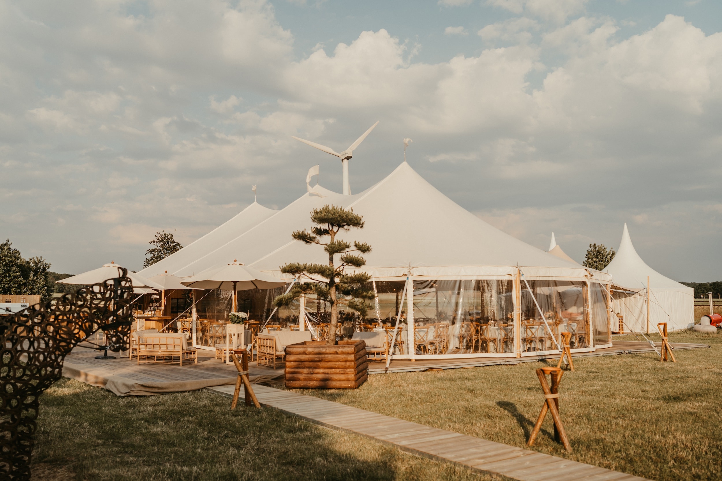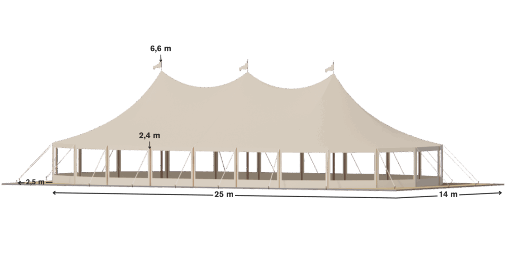 Grande, élégante et spectaculaire, la Tente Silhouette 14 × 25 m est conçue pour accueillir les événements d’envergure avec une présence visuelle incomparable. Sa longueur généreuse et ses quatre mâts centraux créent un volume impressionnant, idéal pour les mariages XXL, galas, réceptions d’entreprise, festivals culturels ou grandes célébrations privées.