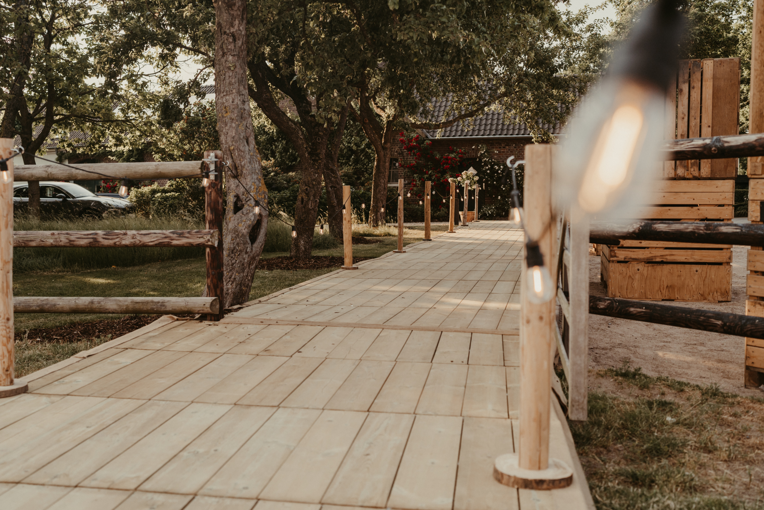 Le recouvrement rustique du walkway, associé à des poteaux élégants et des balustrades en corde, crée un accent visuel parfait pour une gamme d’événements. Que ce soit pour des mariages romantiques nécessitant un élégant portail d’entrée, des galas exigeant une atmosphère sophistiquée, ou des tapis rouges où une entrée impressionnante est primordiale, notre allée est un choix idéal.