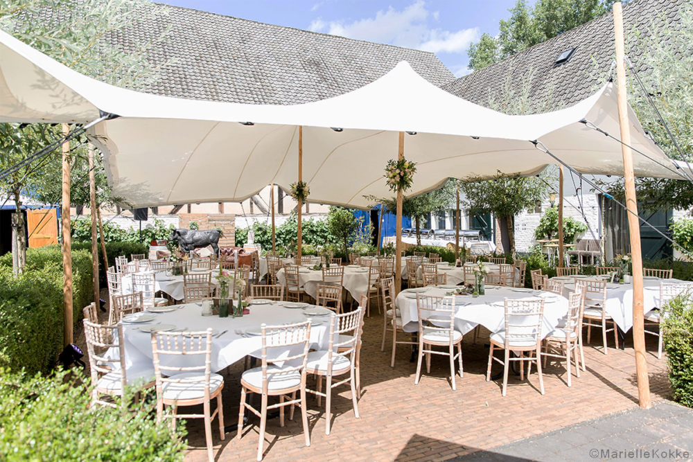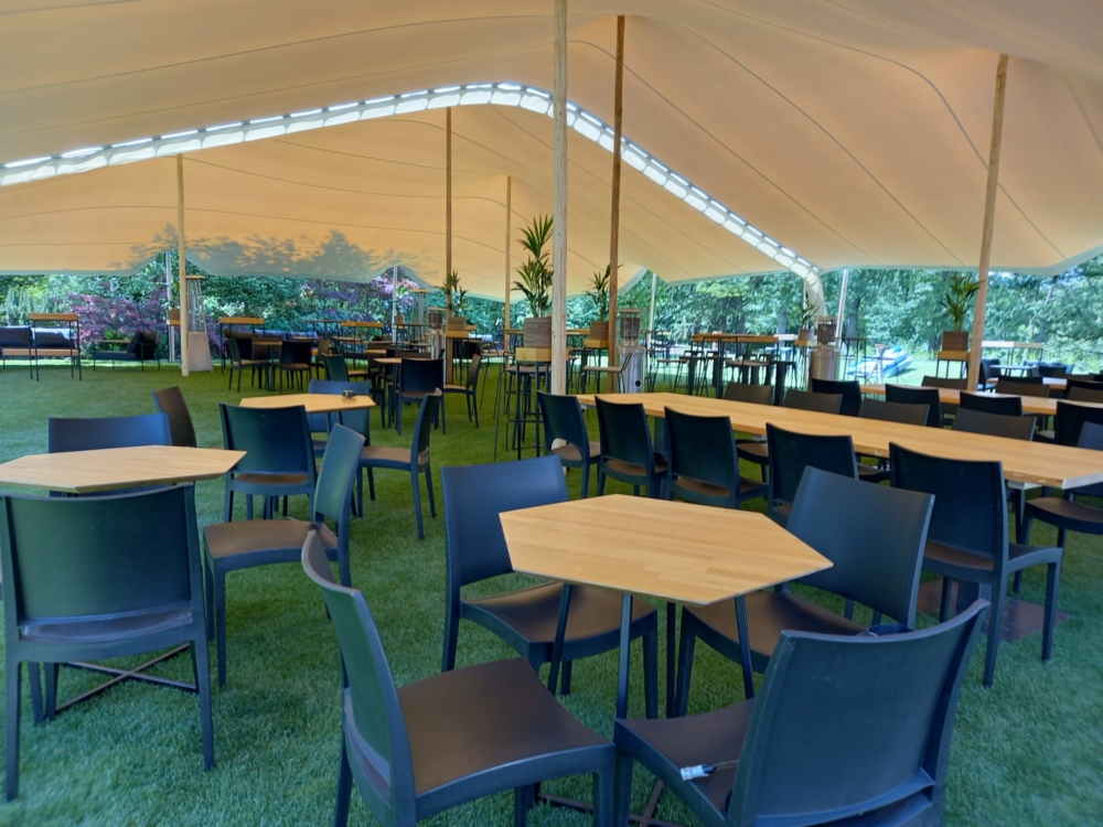 Une tente stretch crée un espace accueillant où l’on se retrouve, à l’abri du soleil comme de la pluie.